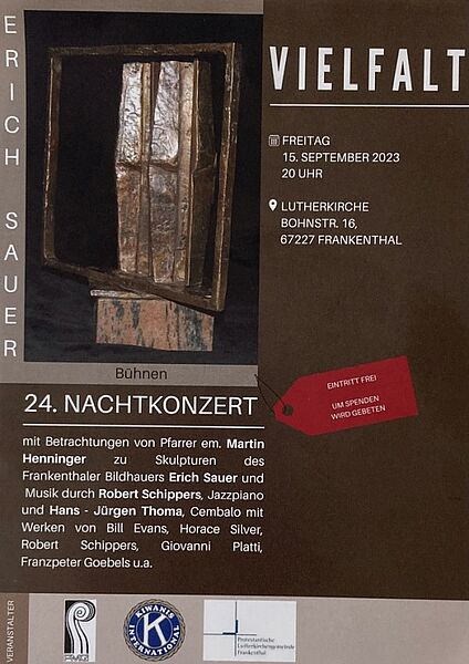 Freitag 15.09.2023 20:00 Uhr in der Lutherkirche. Nachtkonzert mit Betrachtungen von Pfarrer em. Martin Henninger zu Skulpturen des Frankenthaler Bildhauers Erich Sauer und Musik durch Robert Schippers, Jazzpiano, und Hans-Jürgen Thoma, Cembalo.