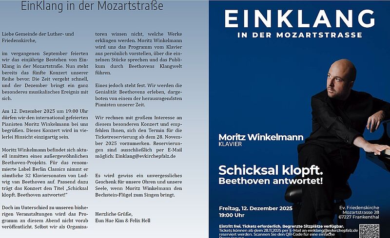 Im Rahmen unserer Konzertreihe "Einklang in der Mozartstrasse" dürfen wir 12. Dezember 2025 um 19 Uhr den Pianisten Moritz Winkelmann in der Friedenskirche begrüßen. Er befindet sich derzeit in einem besonderen Mammutprojekt. Für das Label Berlin Classics nimmt er alle 32 Beethoven-Sonaten auf. Umso schöner, dass er auf seiner musikalischen Reise auch bei uns in Frankenthal Station macht.