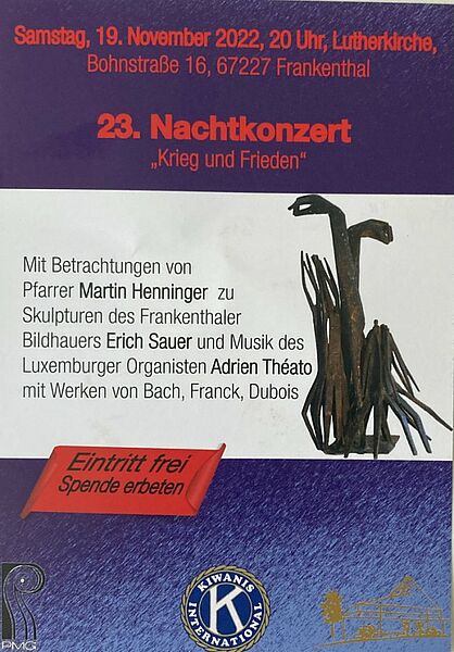 Freitag 06.09.2023 20:00 Uhr in der Lutherkirche. Nachtkonzert mit Betrachtungen von Pfarrer em. Martin Henninger zu Skulpturen des Frankenthaler Bildhauers Erich Sauer und Musik von Telemann, Bach, Jacob, Ibert u. a.. Solisten: Ashby Mayes, Fagott, und Hans-Jürgen Thoma, Cembalo.