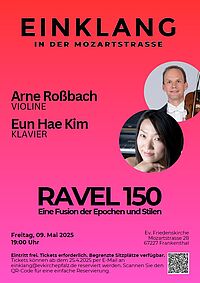 Am 9. Mai 2025 um 19:00 Uhr erwartet Sie das nächste EinKlang-Konzert mit unserem ersten Gastkünstler, dem Violinisten Arne Roßbach vom Nationaltheaterorchester Mannheim. Das Programm “RAVEL 150: Eine Fusion der Epochen und Stile” feiert den 150.Geburtstag von Maurice Ravel, und steht unter anderem im Zeichen des Jazz. Es zeigt, wie Jazz klassische Komponisten inspiriert hat – von Amerika bis in die Pariser Salons.