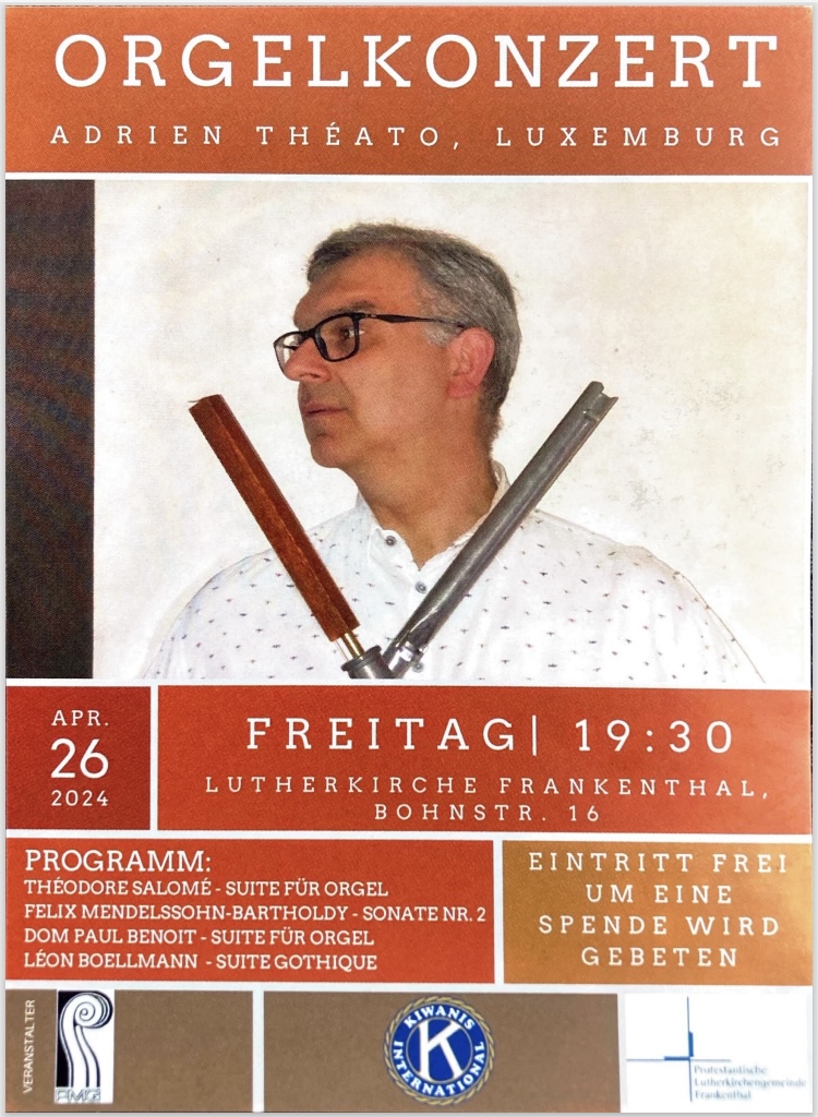 Freitag 26. April 2024 um 19:30 Uhr: Orgelkonzert in der Lutherkirche mit Adrien Théato