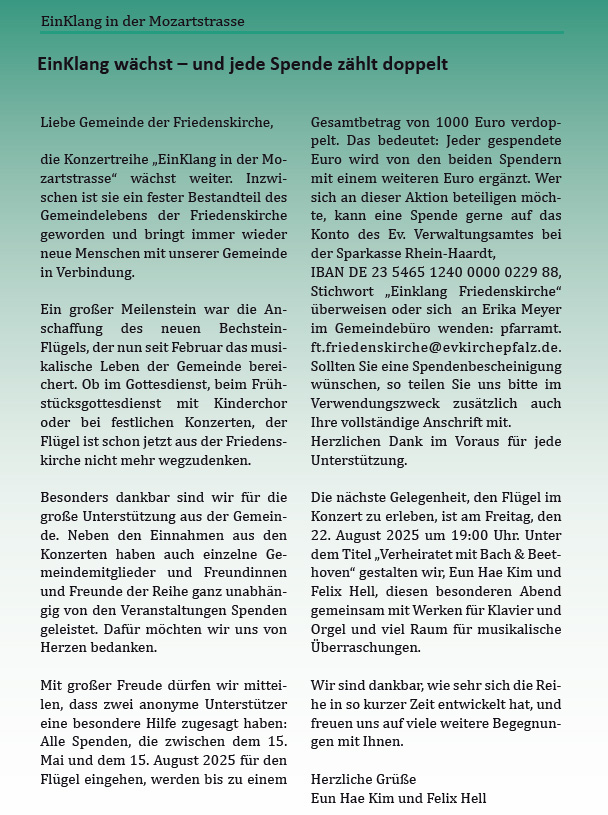EinKlang in der Mozartstraße. Konzert in der Friedenskirche am Freitag 22.08.2025 um 19:00 Uhr