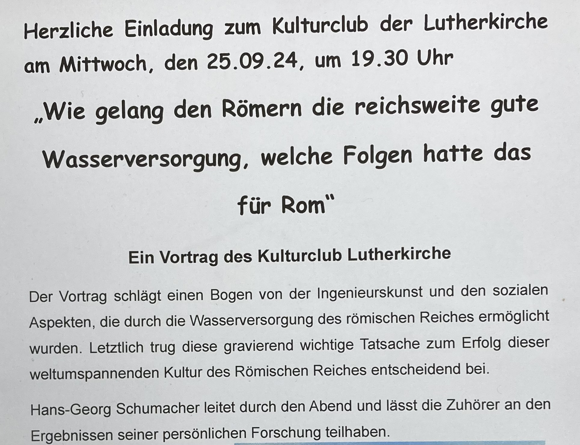 Der Kulturclub der Lutherkirche findet regelmäßig am letzten Mittwoch im Monat, jeweils um 19.30 Uhr im Gemeindehaus der Lutherkirche, statt.