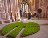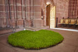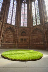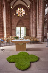In ihrer Installation „PLAN“ überträgt Waltraud Munz dieses Prinzip auf die Stiftskirche Kaiserslautern. Acht große Kreise aus Rollrasen breiten sich im Kirchenraum aus. Ihre geometrischen Formen und Einschnitte spielen auf den Kontext der Kirche in der Stadt an.