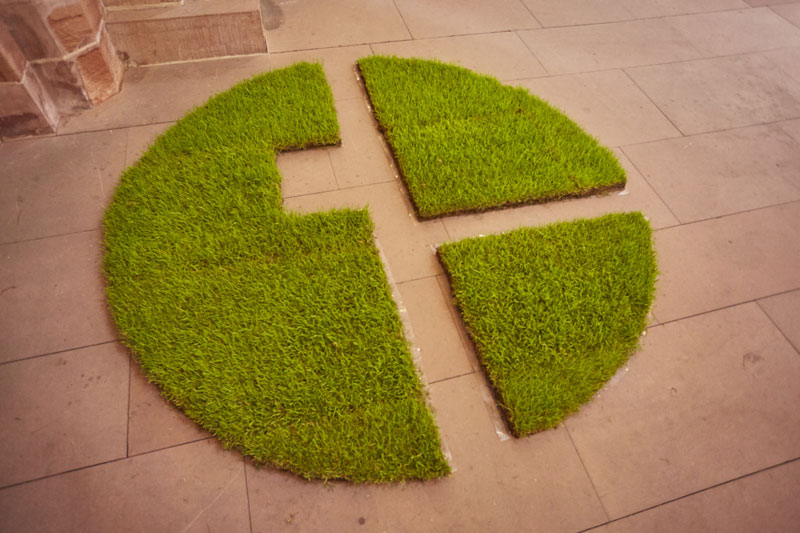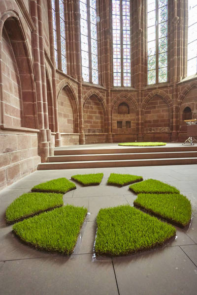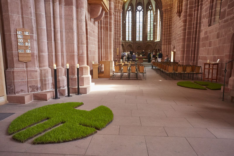 In ihrer Installation „PLAN“ überträgt Waltraud Munz dieses Prinzip auf die Stiftskirche Kaiserslautern. Acht große Kreise aus Rollrasen breiten sich im Kirchenraum aus. Ihre geometrischen Formen und Einschnitte spielen auf den Kontext der Kirche in der Stadt an.