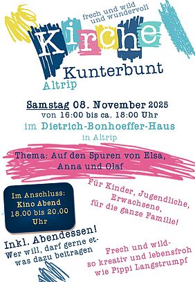 Ein Kirche-Kunterbunt-Nachmittag hat immer drei Phasen: In der Aktiv-Zeit gibt es Stationen zum Toben, Kreativsein, Experimentieren. In der Feier-Zeit staunen wir über Geschichten und Gedanken zu Gott und der Welt, hören Musik und singen miteinander. Und schließlich ist Essens-Zeit – lecker, fröhlich und mit viel Raum für Gespräche und Austausch.