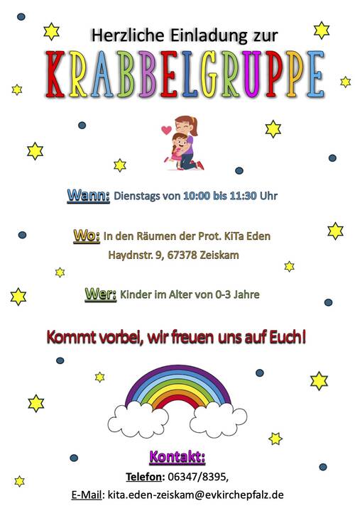 In der Protestantischen Kindertagesstätte „Eden“, Haydnstr. 9, treffen sich jeden Montag von 09:00 Uhr bis 10:30 Uhr alle Kinder zwischen 0 und 3 Jahren zum gemeinsamen Singen, Basteln, Turnen, Toben und Spielen unter der Leitung von Frau Eva Leppert (Erzieherin in Elternzeit) und Frau Lisa Bilz.
