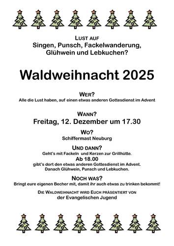 Waldweihnacht an der Grillhütte. Alle, die möchten, können um 17:30 Uhr am Schiffermast zu einem Fackelzug durchs Dorf starten. Wenn wir an der Grillhütte angekommen sind, feiern wir um 18:00 Uhr bei Kerzenschein unseren Gottesdienst für Große und Kleine. Danach gibt es Glühwein, Punsch und Zeit für Gespräche.