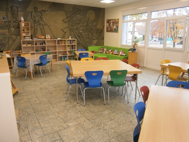 Nach dem Essen wird der Raum für kreative Gestaltungsangebote genutzt. Acryl- und Wasserfarbe oder Buntstifte finden sich hier wieder, ebenso wie Kinetic-Sand und Knete. Auch unsere Leseecke ist hierher umgezogen und läd mit vielen Büchern für Erstleser, aber auch Comics und viele Sachbücher zum ruhigen Vertiefen ein.