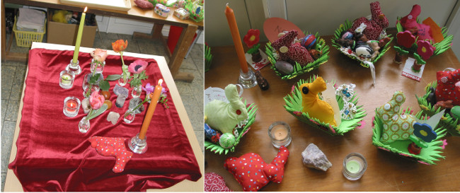 Herr Pfarrer Schwarz war bei uns zu unserer Osterfeier. Doch bevor bei Kuchen, selbst bemalten Eiern und Kaba gefeiert wurde, haben Kinder und Erwachsene Symbole auf ein Bild gelegt. Dabei haben wir uns Gedanken gemacht, was diese uns bedeuten und woran wir denken.